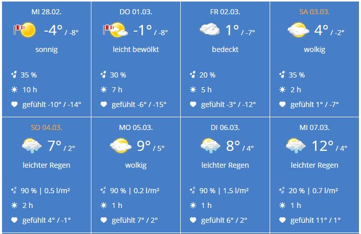 Und Besserung ist ja in Sicht. Ein Blick auf die Wettervorhersage verspricht uns schon in wenigen Tagen deutlich wärmere Luft.