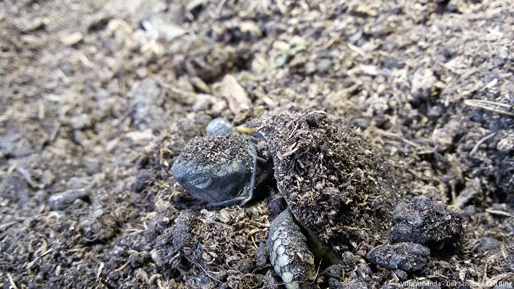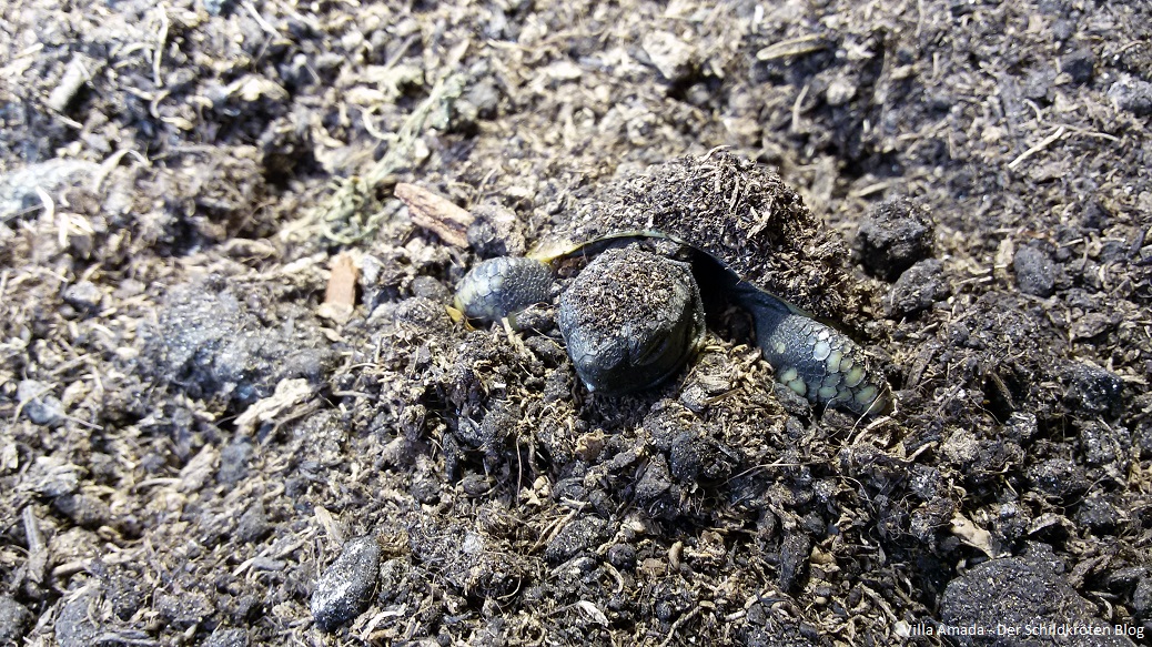 Heute am frühen Nachmittag schauten plötzlich zwei Vorderbeine und ein Kopf aus der Erde. Die erste Schildkröte kam heute aus der Erde. Dieses Jahr eine der Nachzuchten.